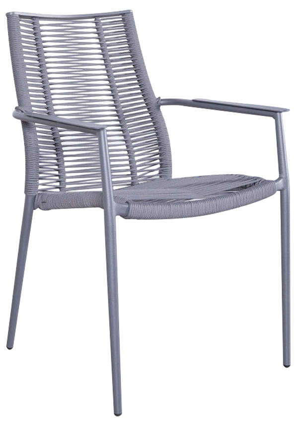 The real character comes from the cord or rope weaving that fills both the back and seat. It runs in tight horizontal bands, wrapping closely together to create a dense, textile-like surface. The warm grey tone of the cord blends seamlessly with the frame finish, treating the whole chair as a single cohesive object.