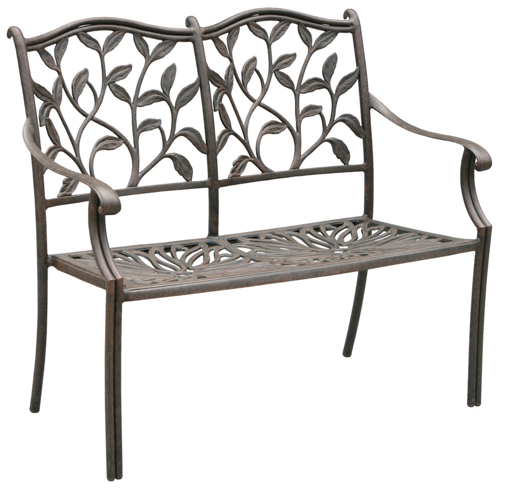 The back is the heart of it, a branching vine motif with individual leaves sprouting off twisting stems that fill the frame organically. It's not stiff or symmetrical; instead, it has a slightly wild, grown-into-itself quality, as if the vines found their own way to fill the space. For a garden or patio setting, that connection to nature feels entirely fitting.
