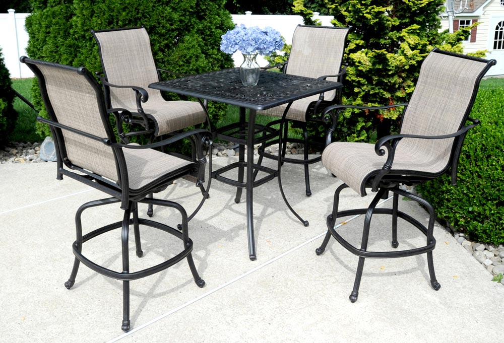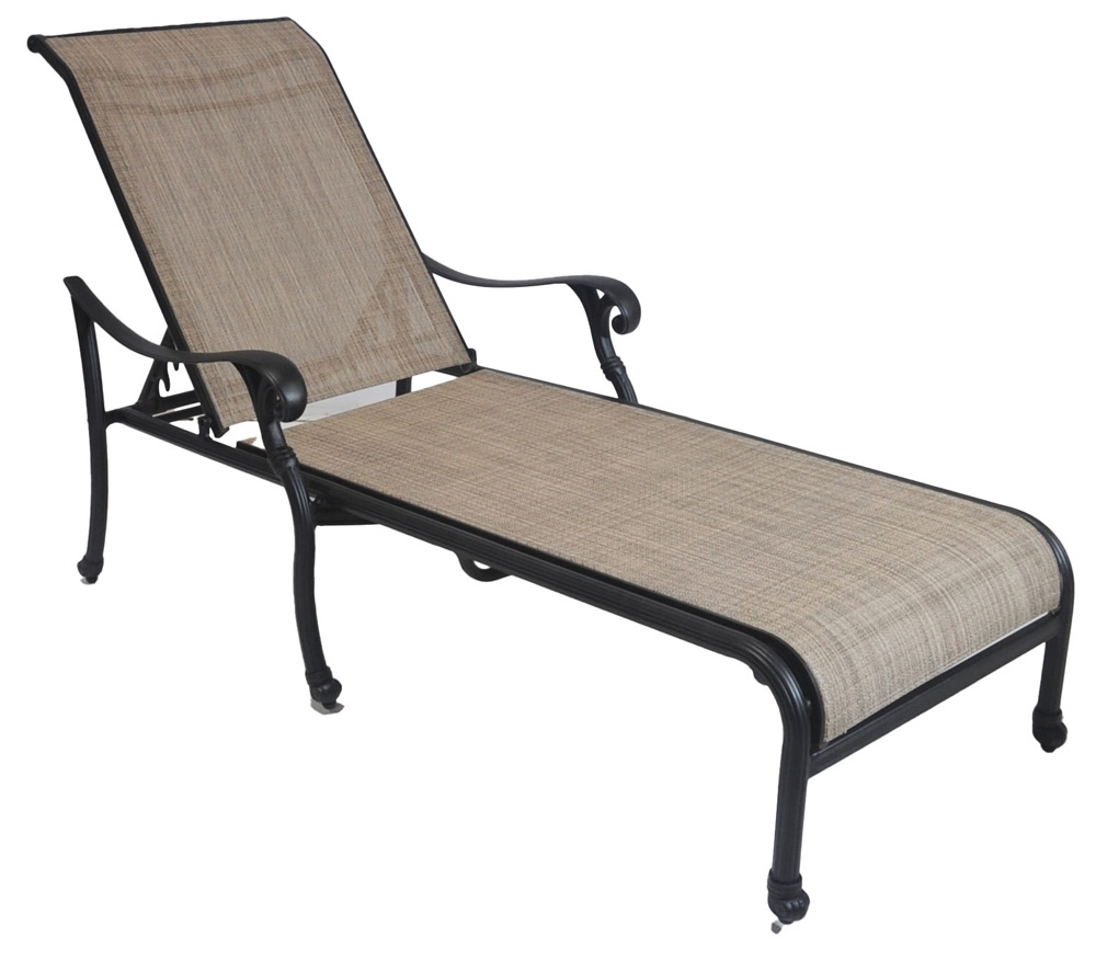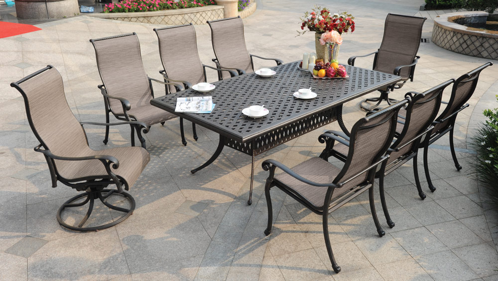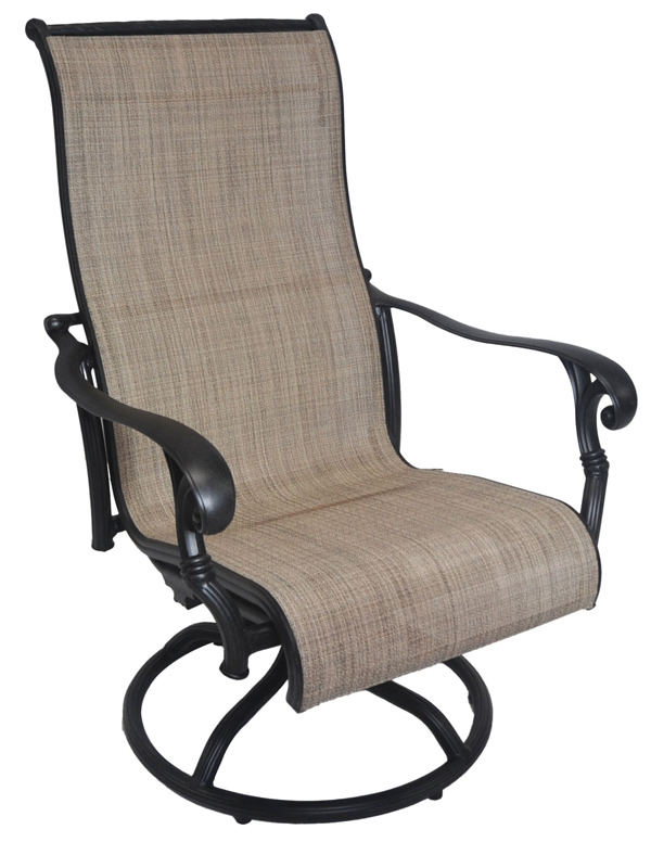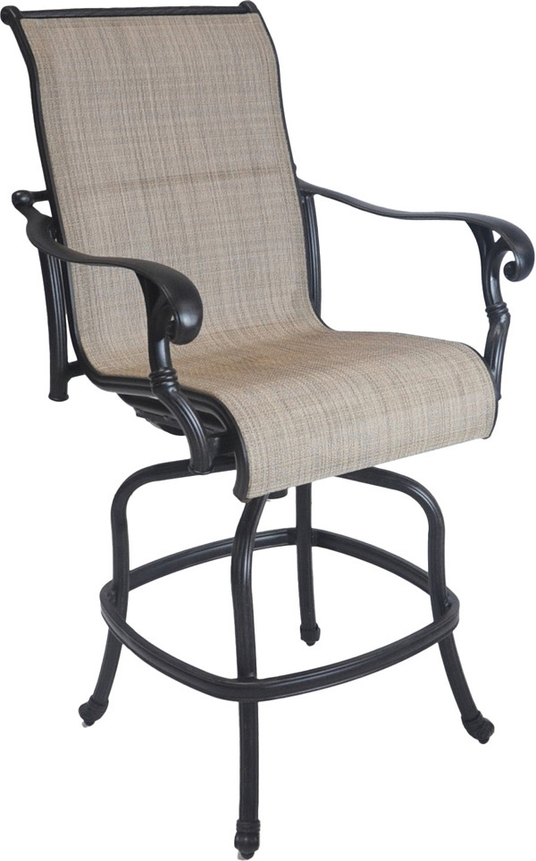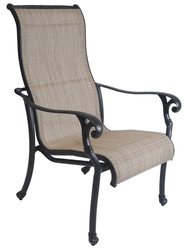 The Summit patio dining chair takes a different approach from the cast alternatives. The frame is cast aluminum in an Antique Bronze finish, with the same scrolled arm details and gently fluted leg styling that give the line its traditional character. But here, the back and seat are fitted with a taut sling fabric in a warm neutral weave that spans cleanly from rail to rail.