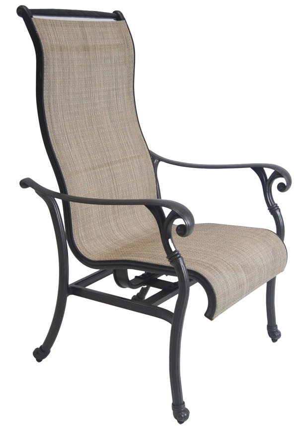The high back is the first thing you notice. It offers genuine support and a more upright, substantial presence than a standard dining chair, making it as comfortable for a long evening outdoors as it is for a meal. The sling itself has a subtle texture that catches the light, and the neutral tone sits easily alongside almost any table finish or outdoor palette.
